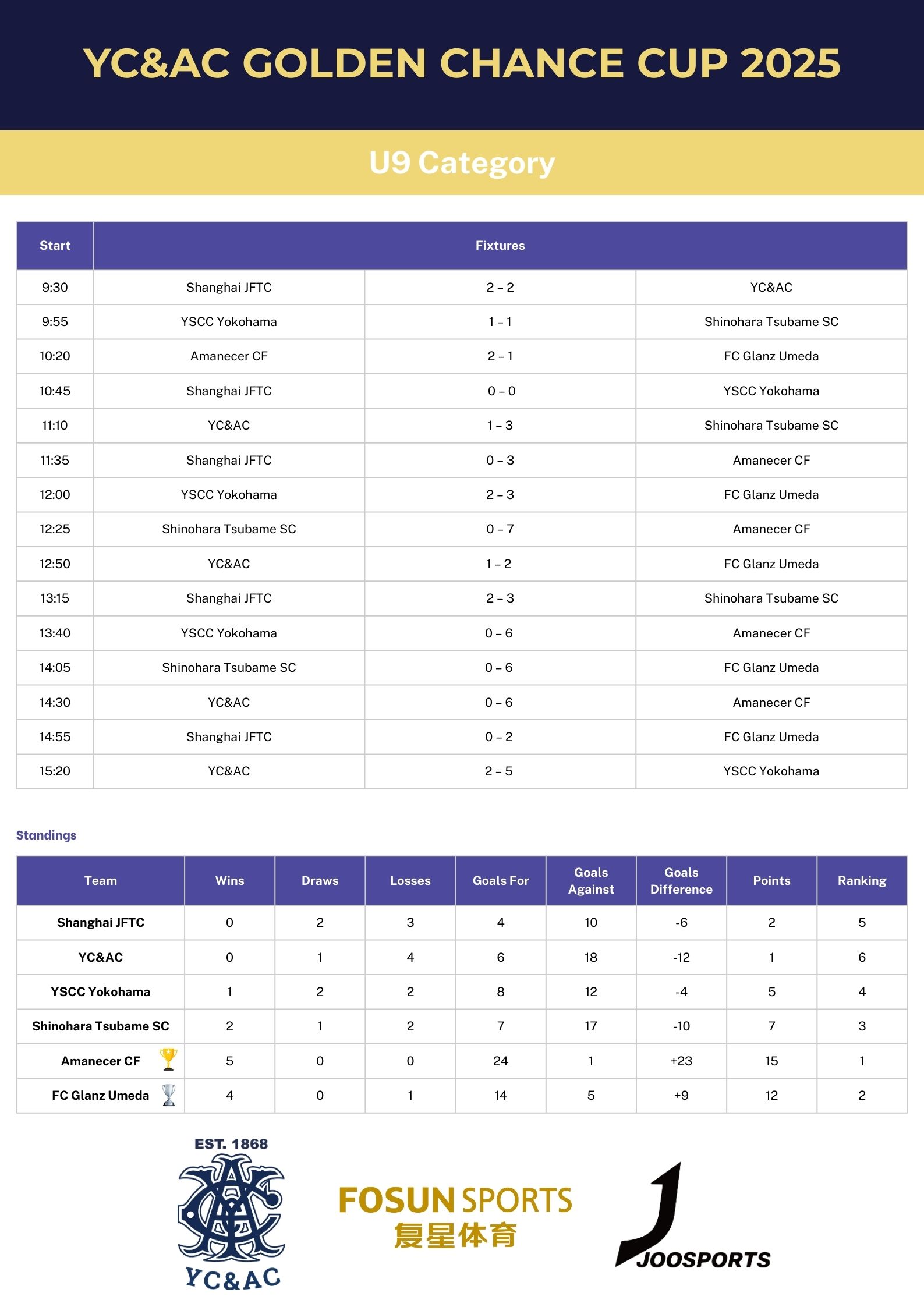 The YC&AC Golden Chance Cup 2025 brings together a select group of U9 and U11 teams from Japan and East Asia. Each club adds its own style, energy, and ambition, creating a tournament full of exciting matches and memorable moments.